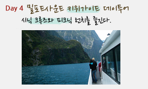 4일 - Queenstown to Queenstown (via Milford Sound day tour) - 퀸즈타운에서 코치버를 타고 밀포드사운드로 이동 - 웅장한 협곡을 시닉크루즈를 타고 즐김 - 다시 코치버스를 타고 퀸즈타운으로 돌아옴